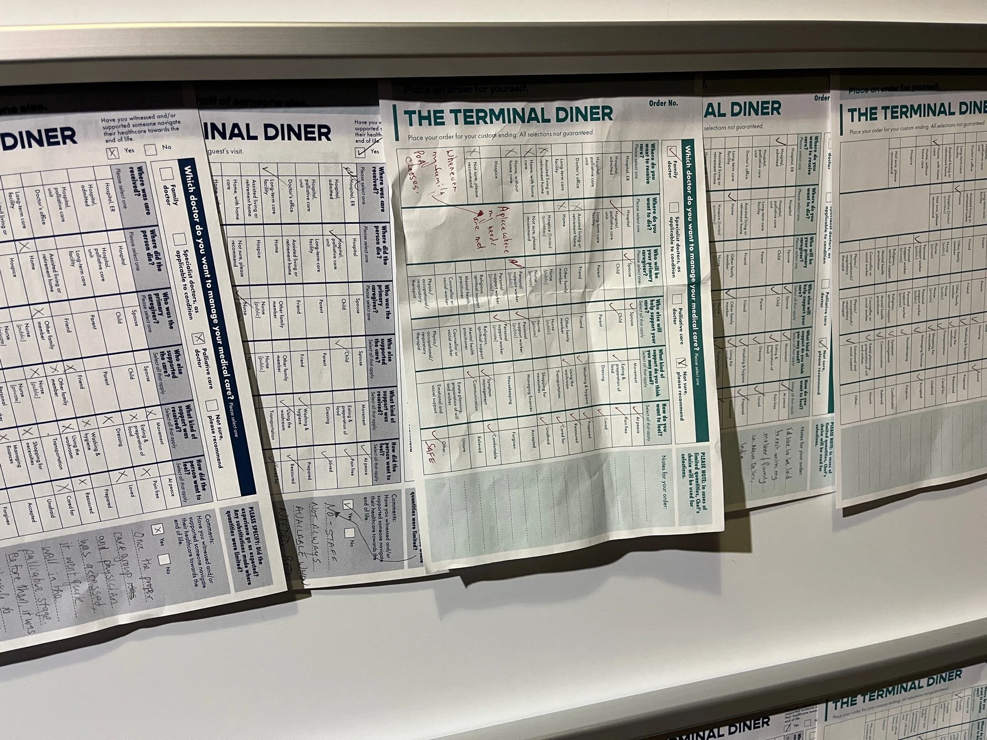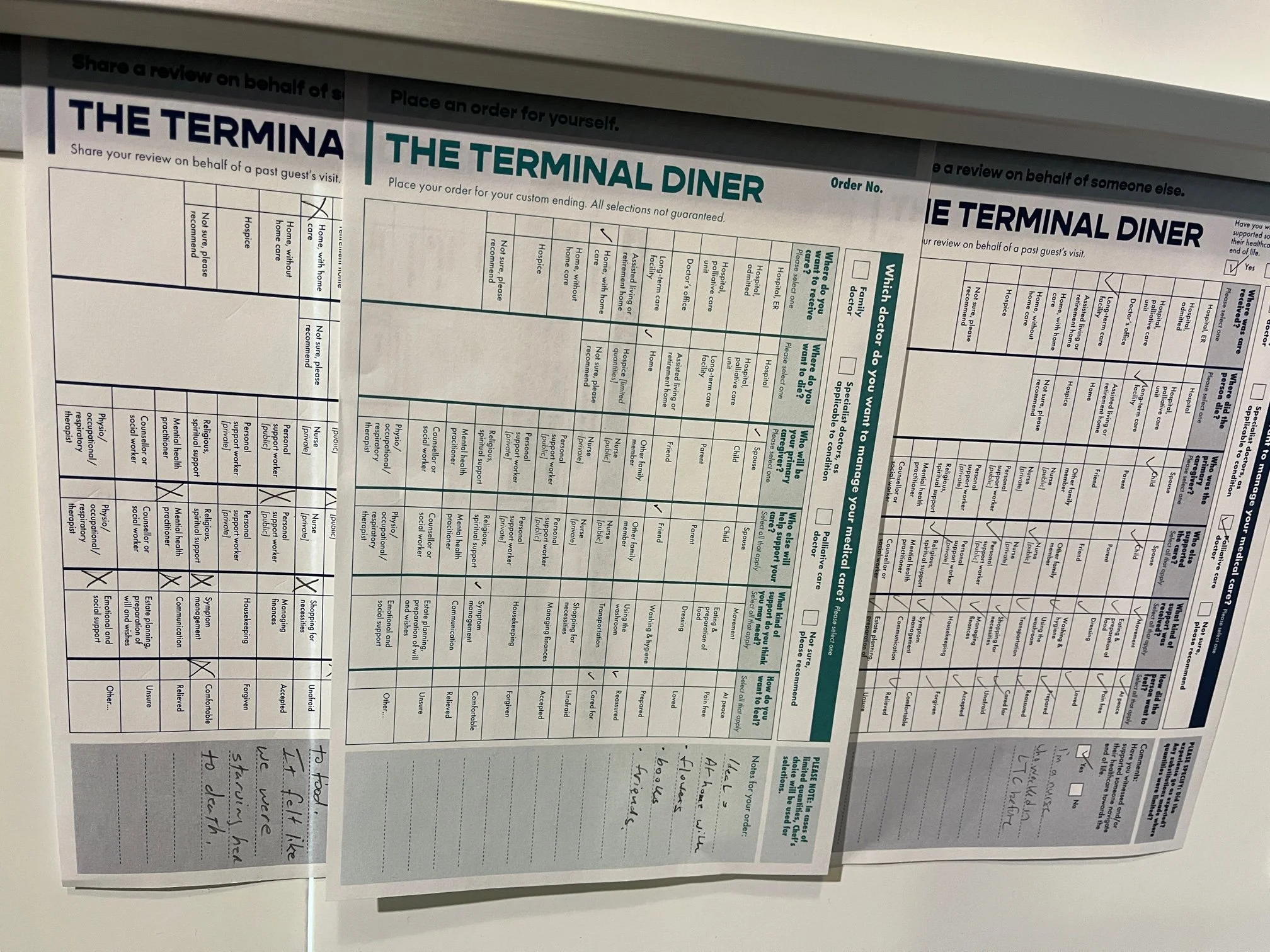 “The Terminal Diner” explores the end-of-life healthcare experience of people in Ontario. The participatory installation borrows characteristics of a diner and invites participants to complete menu “chits” detailing selections for their “orders” for their own desired end-of-life, capturing participants’ desired experiences surrounding death. Participants can also leave “reviews” of past experiences, capturing their lived experience of a loved one’s end-of-life care.